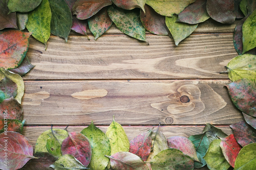 frame of autumn colored leaves on wooden planks background - for greetings - top view