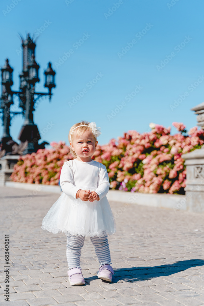 A beautiful little toddler girl in a white fluffy dress walks in a flower garden, a bright concept of holiday and summer, a very active action
