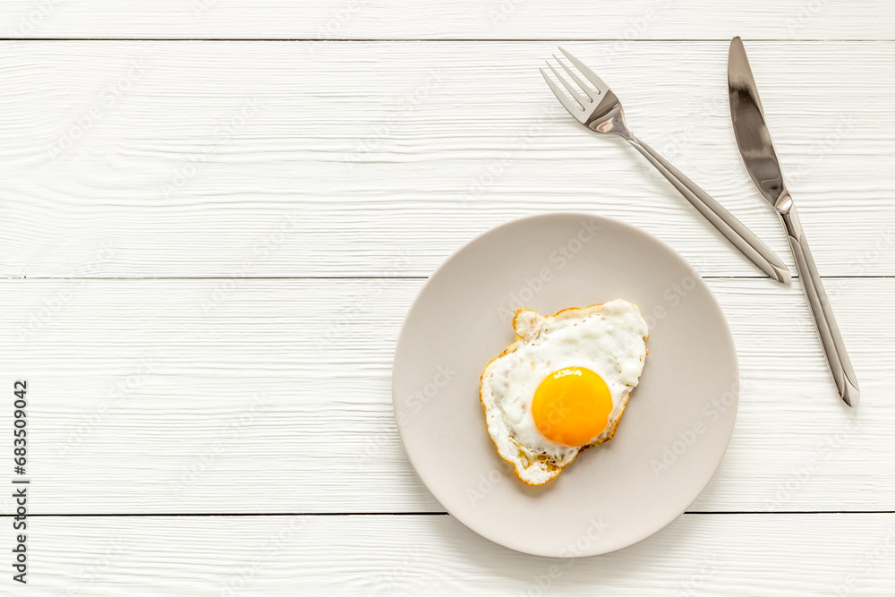 One fried egg on plate, top view. Breakfast background