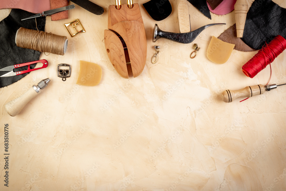 Workplace of leather goods worker, handbag or shoe manufacturing industry, flat lay