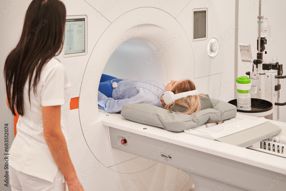 Young lady laying on CT scan bed while female radiologic technician turning on panel control