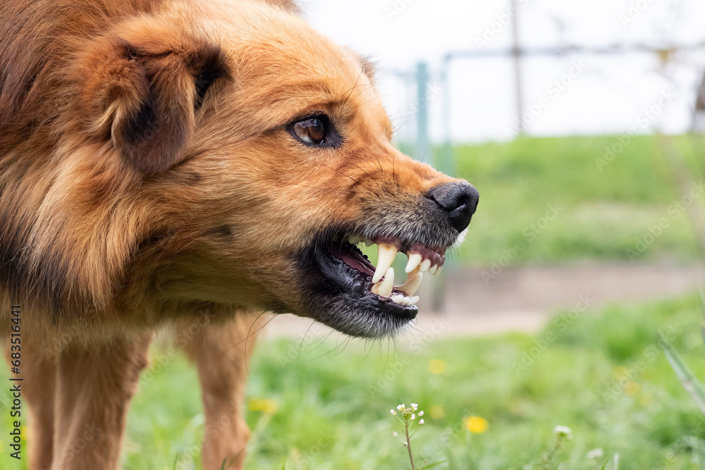 Aggressive dog barks, baring teeth. Dangerous Angry Dog