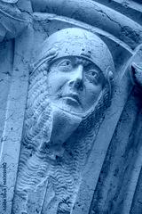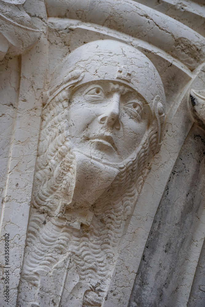 The head of a knight in helmet and chain mail, carved in stone. One of 600 figures on column capitals of the Doge’s Palace in Venice, Italy. Done between 1340 and1355, by the Stone-Carvers Guild.