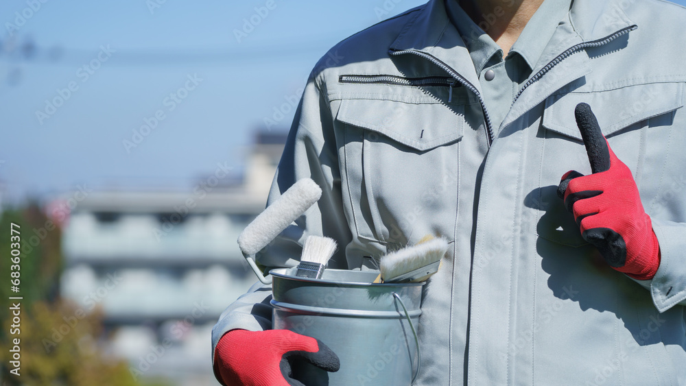 塗装道具を持つ作業服の男性|リフォーム・塗装業者イメージ