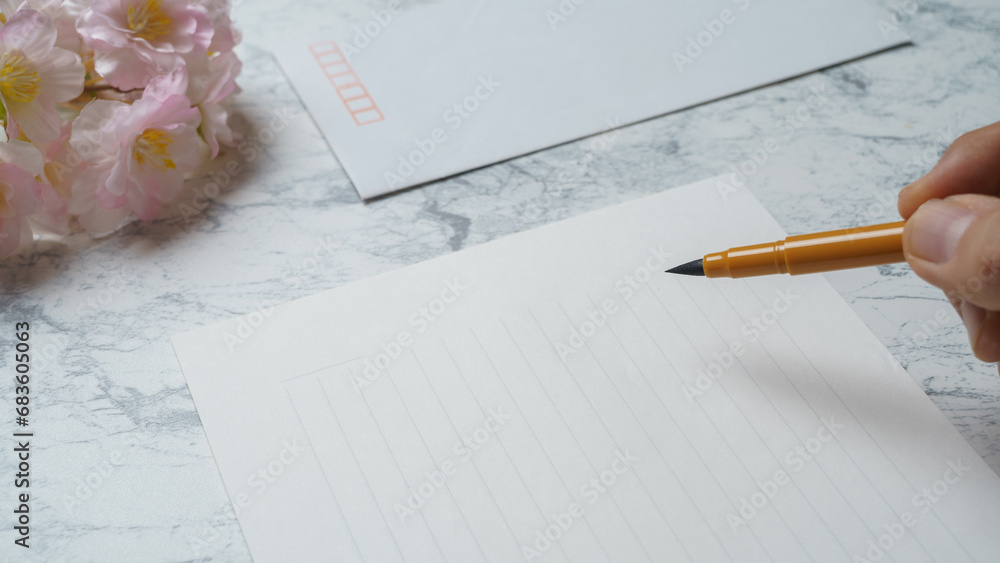 日本の便箋と筆ペンと桜 春のお便りイメージ