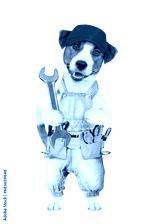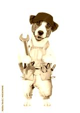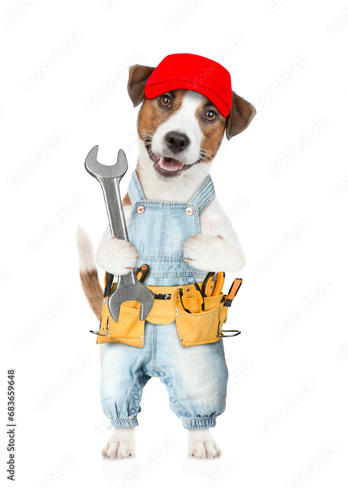 Funny Jack russell terrier puppy wearing red cap and denim overalls with tool belt holds big wrench. isolated on white background