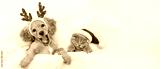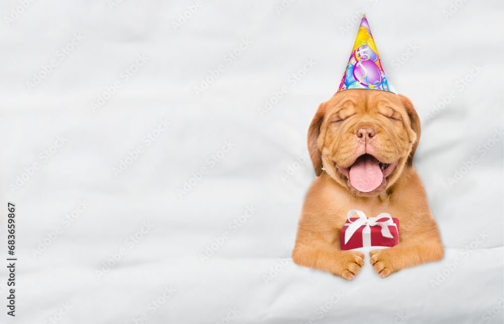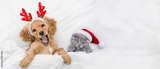 Yawning English Cocker spaniel puppy dressed like santa claus reindeer Rudolf lying with cozy kitten under white blanket at home. Top down view. Empty space for text