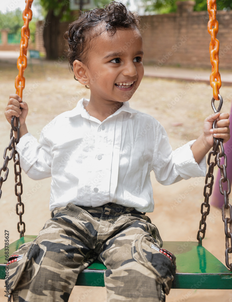 Happy little indian boy having fun on a swing on sunny day. Healthy summer activity for children.