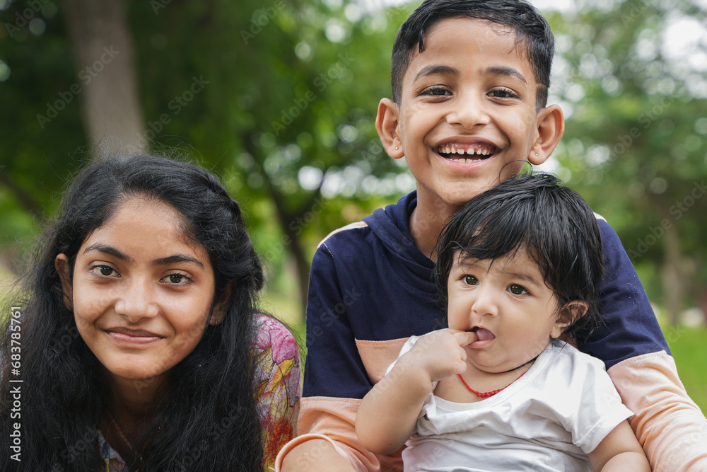 Three Cute indian kids enjoying their summer vacation at park or garden.