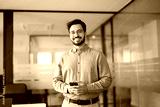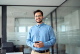 Smiling busy professional latin business man standing in office holding mobile cellphone. Young happy businessman employee using smartphone looking at camera using cell phone tech at work. Portrait.