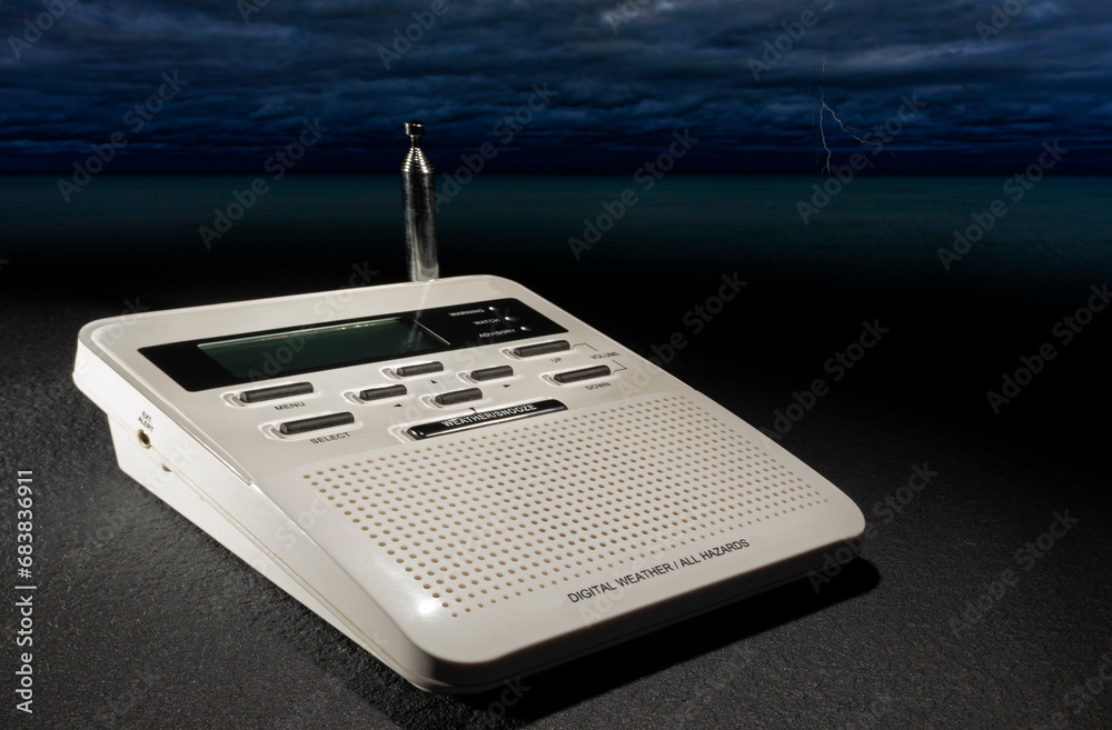 Digital hazards and weather radio with storm and lightning behind