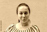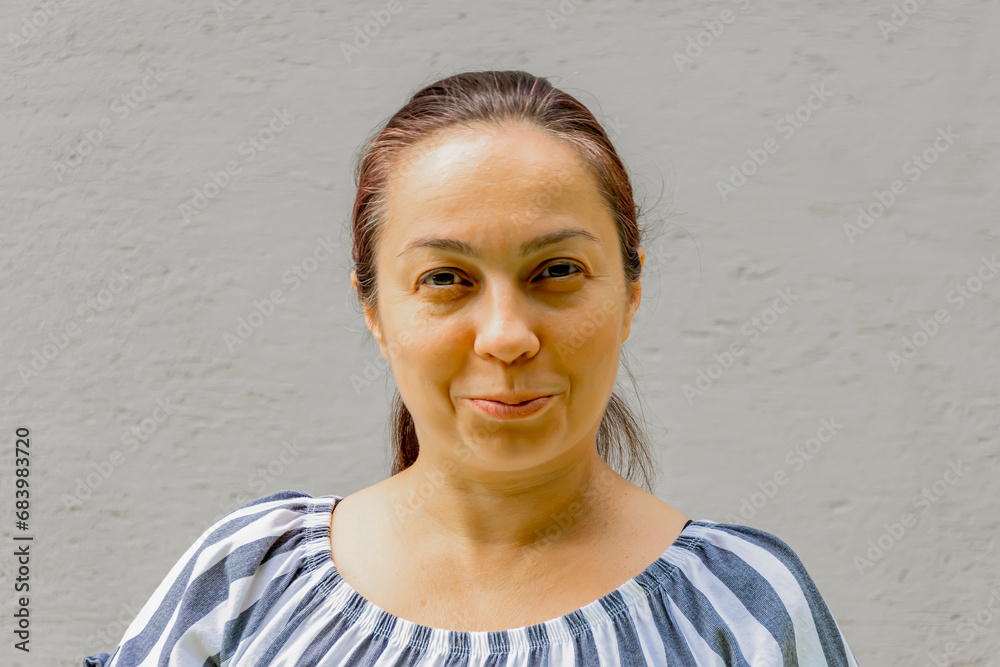 Portrait of a woman 40-45 years old with black hair and a light dress on a gray background. vertical photo.