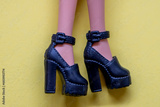 slender legs of a doll wearing black heeled shoes on a yellow background.