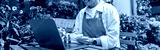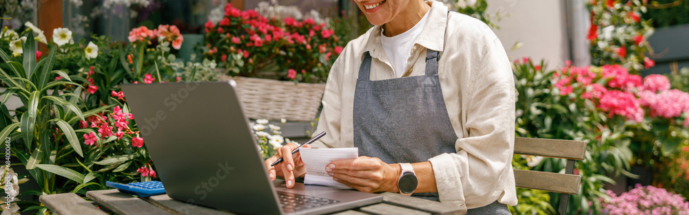 Beautiful flower shop owner wearing apron working on laptop in her store