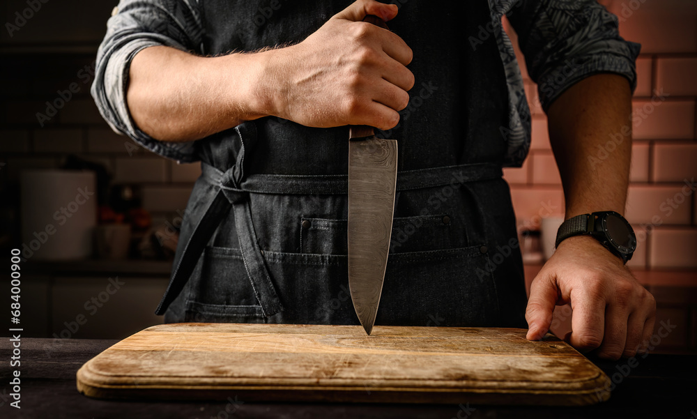 Chief man in apron stubs knife blade to wooden board at kitchen. Restaurant professional with culinary tool