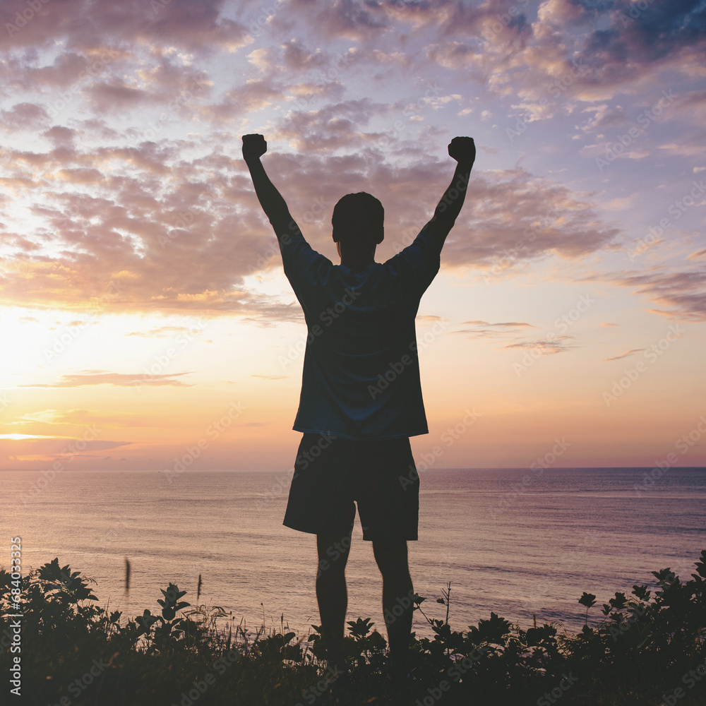 Man raising fists up the sunset sky