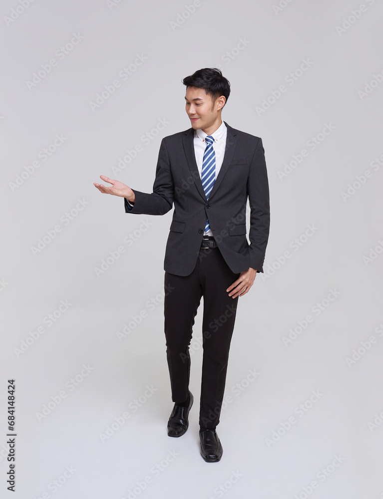 Handsome and friendly face asian businessman smile in formal suit on white background studio shot.