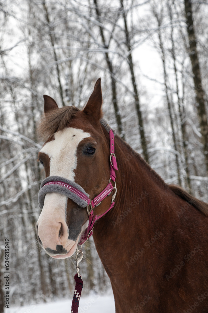 Portrait of a beautiful brown horse. Winter snowy day. A beautiful horse. Horse's head.