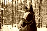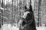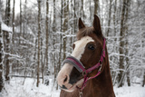 Portrait of a beautiful brown horse. Winter snowy day. A beautiful horse. Horse's head.