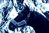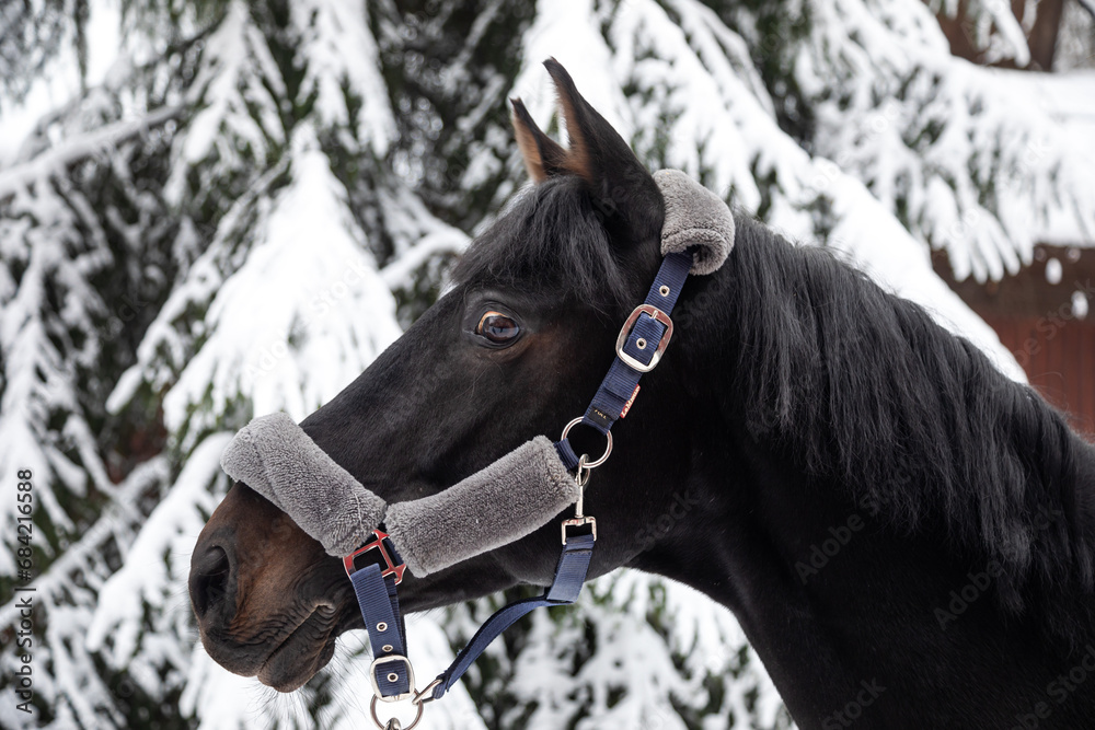 Portrait of a beautiful black horse. Winter snowy day. A beautiful horse. Horse's head.