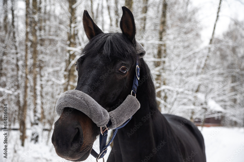 Portrait of a beautiful black horse. Winter snowy day. A beautiful horse. Horse's head.