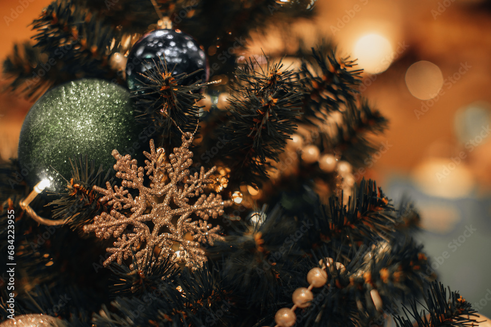 Golden shiny snowflake hanging on a Christmas tree with flashing golden lights. Decorated spruce branches