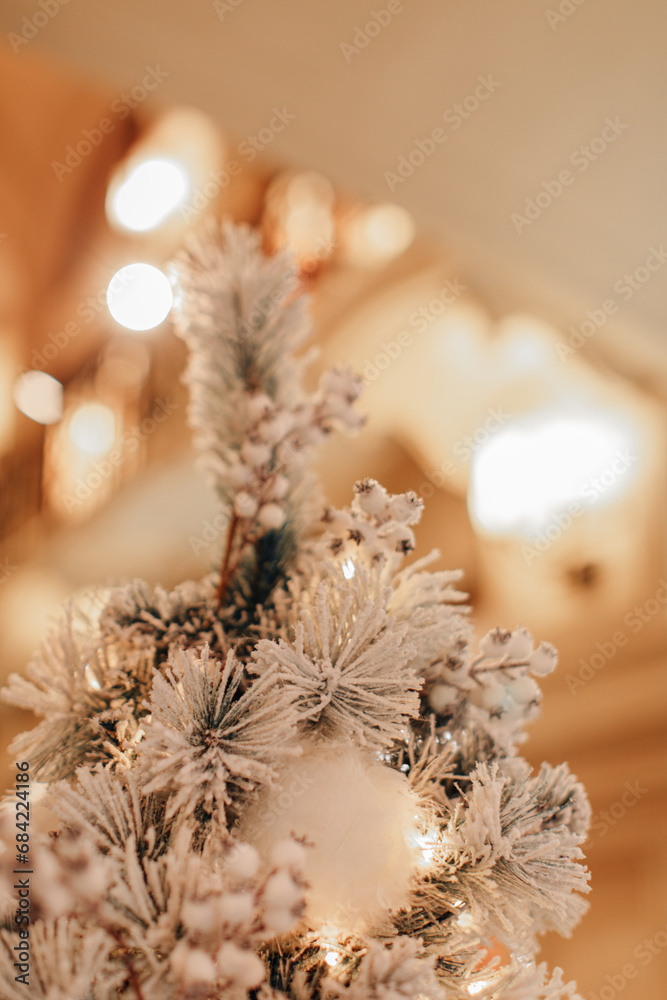 White snow covered Christmas tree, decorated with snowflakes and forest cones. Festive details in the interior