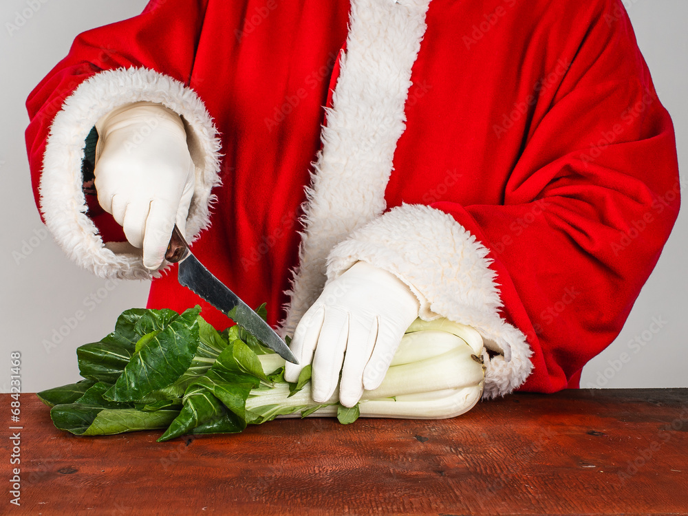 Santa Claus prepares a festive dish from fresh bok-choy. Healthy food concept.