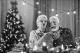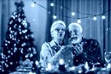 A jolly senior couple is celebrating christmas and new year's eve at home with confetti.