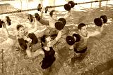 Happy fitness class doing aqua aerobics with foam dumbbells