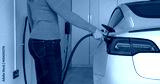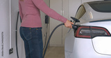 CLOSE UP: Woman approaches an electric car and disconnects it from charging unit