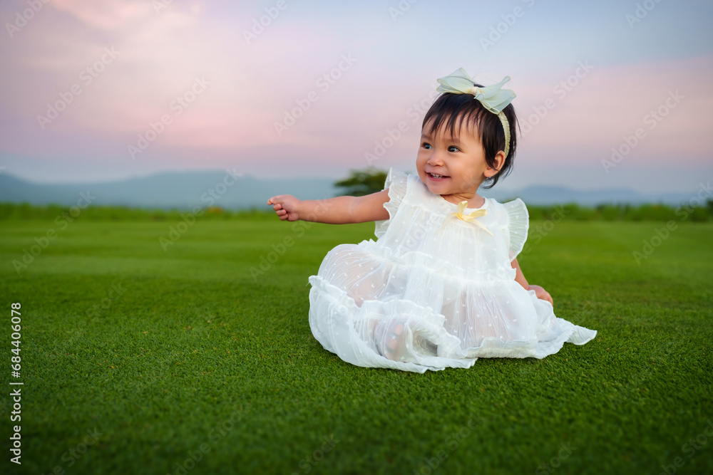 happy infant baby girl in white dress sitting on grass field with sky and mountain background