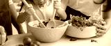 Happiness asian family with father, mother and daughter preparing cooking salad vegetable food together in kitchen at home, happy dad, mom and kid cooking breakfast with salad, lifestyles concept.