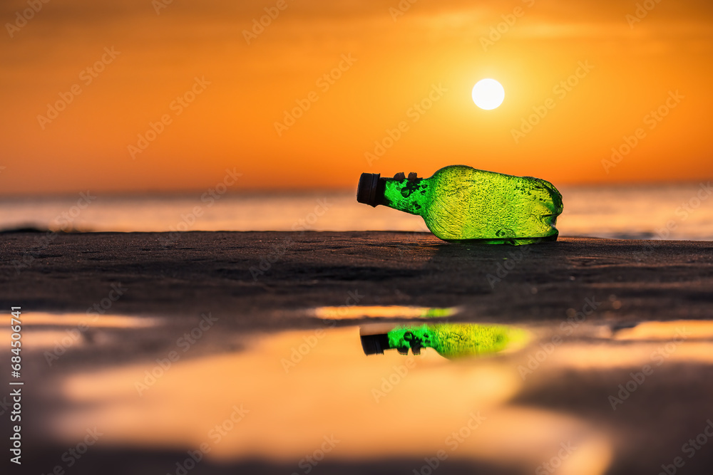 Sea sunrise and plastic alcohol bottle on the beach sand and splashing waves on the shore