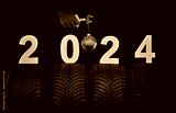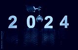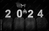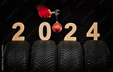 Winter car tires, big wheels service and hand of mechanic man with wrench and christmas ball on 2024 background