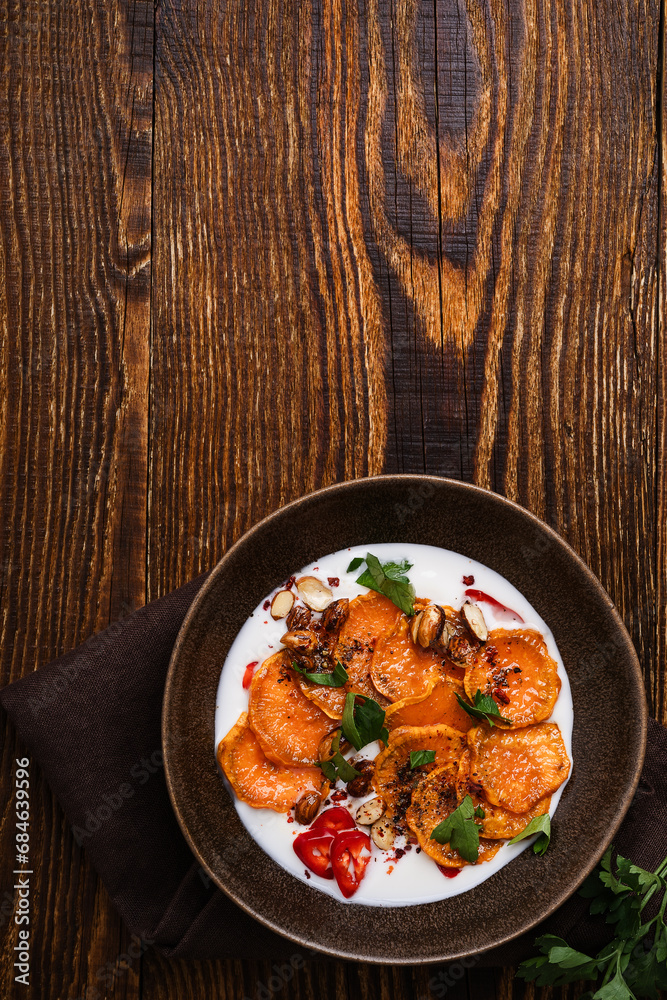 Baked sweet potatoes with Greek yogurt, healthy vegetarian meal