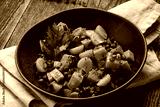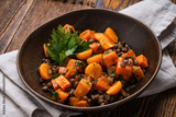 Healthy vegan meal, winter warm salad with roasted sweet potatoes, lentils and herbs