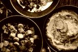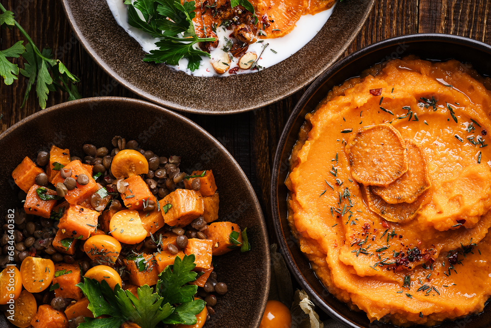 Healthy vegan meal, winter or autumn comfort food with sweet potatoes, high angle view, close up
