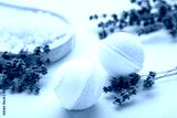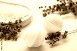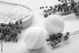 Natural cosmetics. Handmade lavender bath bombs and lavender flowers on beige background.