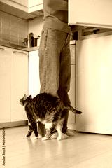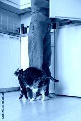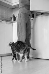 Domestic hungry multicoloured cat begging food from refrigerator rubbing of pet woman's legs on kitchen at home. Interested pet near owner and fridge. Cute fluffy animals pets maintenance content care