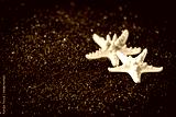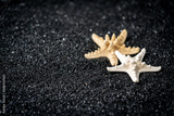 Symbolic tropical black sandy beach background, sea shells and starfish and empty space for product advertisement Montage of summer relaxation background