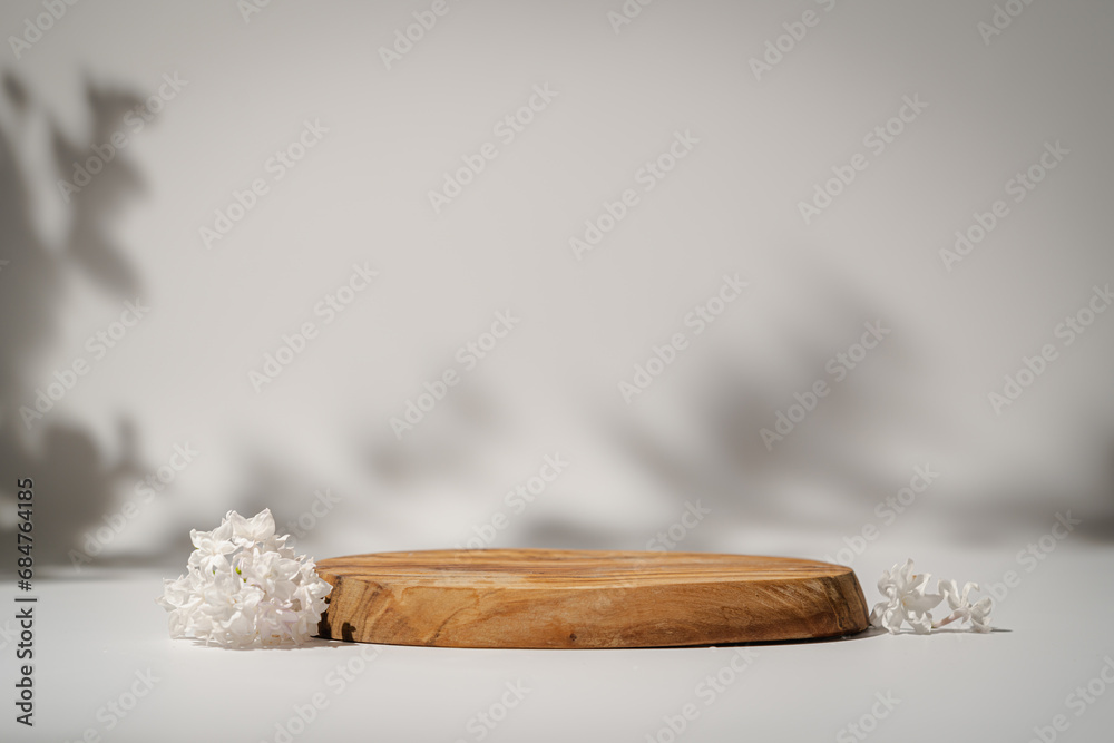 Geometric empty podium wooden platform stand for product presentation and spring flowers and shadows on white background.