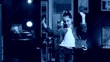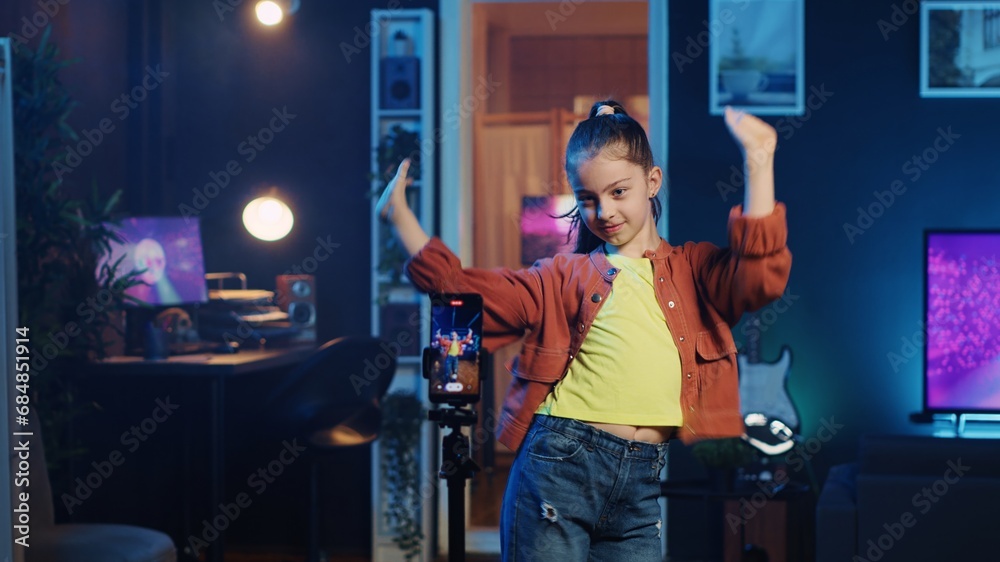 Kid doing viral dance choreography in living room with 3D rendered animations on computer screens in background. Child dancing in neon lit home studio interior, producing content with cellphone