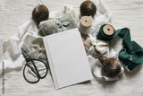 Christmas stationery still life. Blank greeting crad, invitation mockup. Set of silk, velvet ribbons, paper Christmas balls. Old black scissors on table. Gift wrapping, craft concept. Flatlay, top