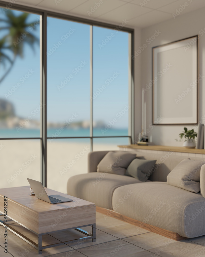 Interior design of a modern living room with a cozy couch near by the window with a coast view.