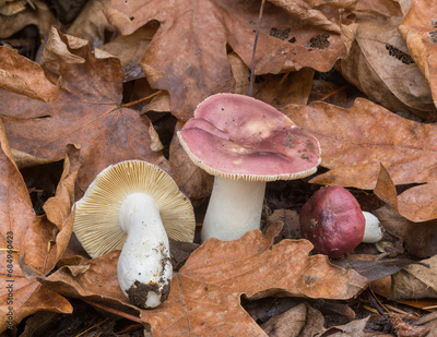 Red Russula Mushrooms. Upper Stevens Creek County Park, Santa Clara County, California, USA.