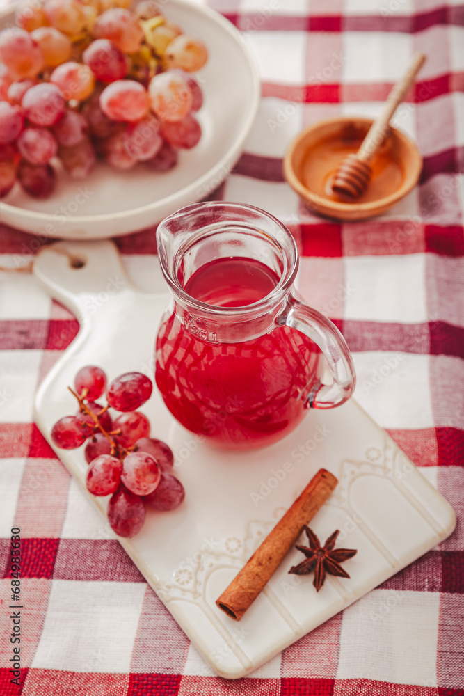 Homemade organic red vinegar with cinnamon and anise. Red grape balsamic vinegar made from fermented fresh grapes.