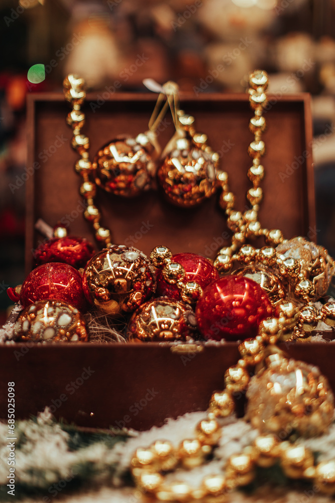 Magical Christmas composition of shiny gold and red New Year's balls and glossy beads. Festive New Year vertical background