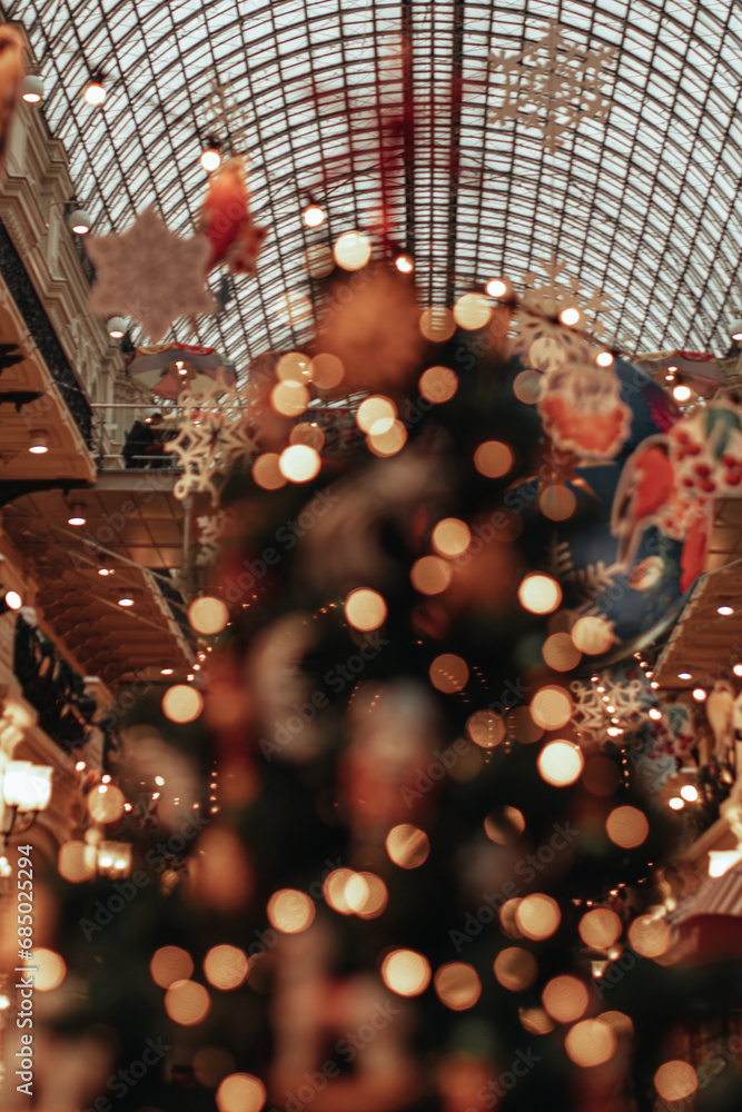 Abstract blurred New Year background, Christmas golden lights in the interior. Abstract festive poster