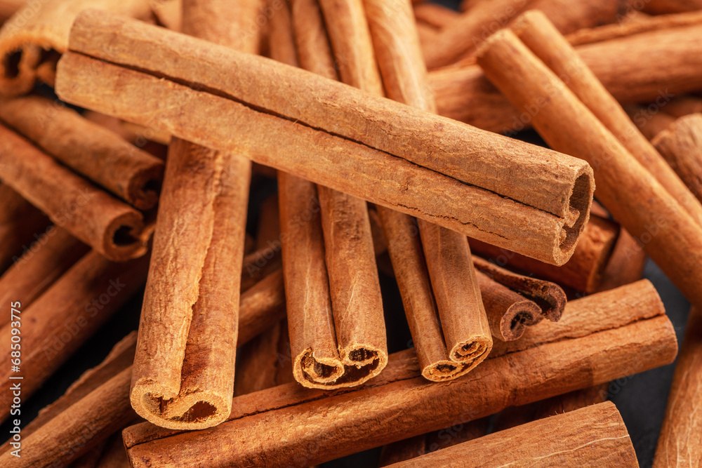 Cinnamon sticks against the background of a gray stone table.